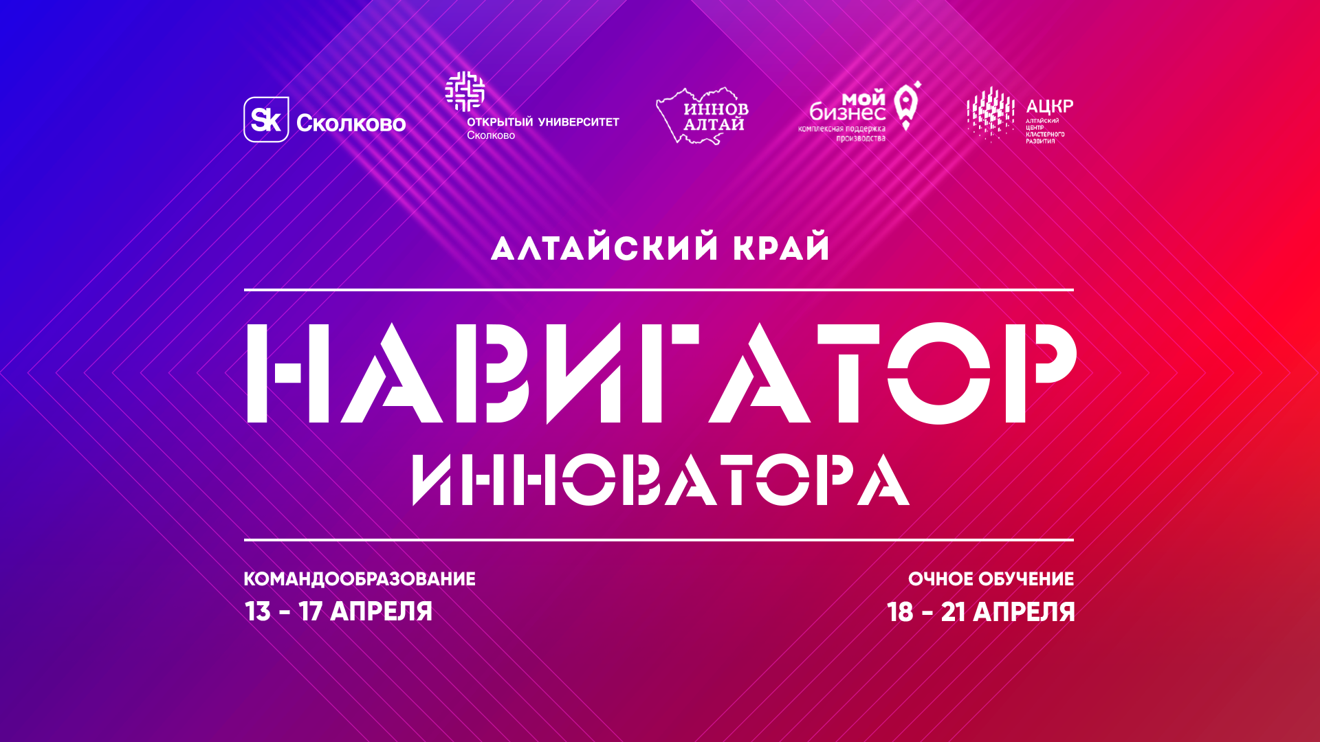 Фонд «Сколково» , Открытый университет Сколково и Министерство экономического развития Алтайского края при поддержке Краевого автономного учреждения «Алтайский центр кластерного развития» открыли набор участников преакселерационной программы «Навигатор инноватора. Алтайский край» для студентов, аспирантов и молодых ученых региона. Программа пройдет с 18 по 21 апреля в очном формате.