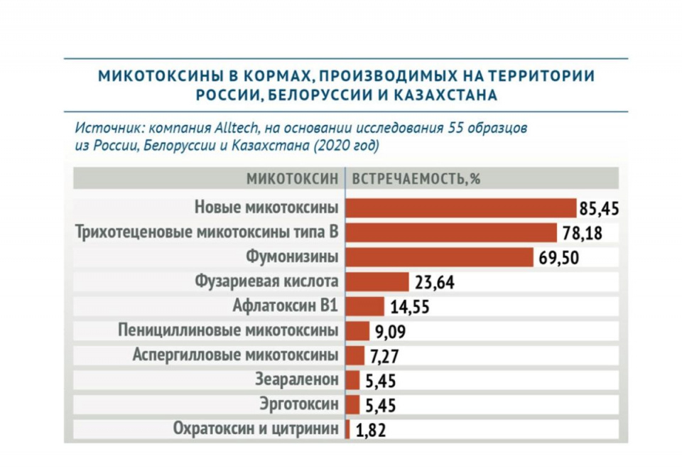 Согласно результатам мониторинга растительного сырья, проведенного компанией Alltech в 2020 году, одной из заметных тенденций является рост количества так называемых новых микотоксинов, которые начали привлекать внимание научного сообщества относительно недавно. К таковым относятся фузапролиферин, боверицин, энниатины А и В, монилиформин, кульморин, бутенолид, альтернариол, эмодин, микофеноловая и тенуазоновая кислоты. Именно они преобладают в кормах, производимых на территории Таможенного союза стран – участников ЕАЭС. Проблему усугубляет и тот факт, что «новые» микотоксины не определяются при помощи стандартных тест-систем, более того, их содержание в растительном сырье не регулируется законодательно. В то же время влияние «новых» микотоксинов на здоровье и продуктивность животных еще недостаточно исследовано, и объективно оценить риск скармливания кормов, контаминированных микотоксинами этой группы, довольно сложно.