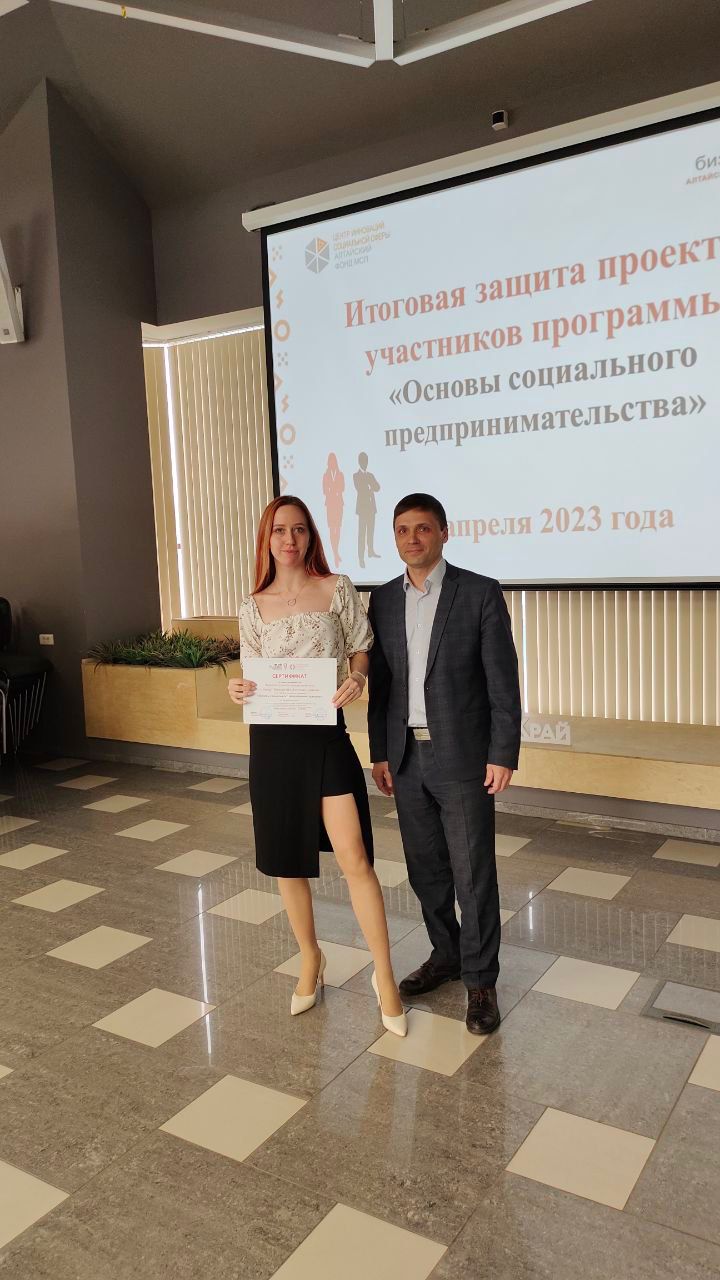 В завершении мероприятия всем слушателям, успешно прошедшим обучение, заместитель начальника отдела развития малого и среднего предпринимательства Управления Алтайского края по развитию предпринимательства и рыночной инфраструктуры Артеменко Даниил Юрьевич вручил сертификаты, поблагодарил за участие в обучении и пожелал успехов в дальнейшей работе в сфере социального бизнеса.