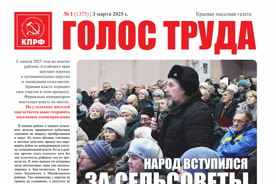 Читайте в новом выпуске, с какими бедами могут столкнуться алтайские села при переходе к системе муниципальных округов (стр. 1). В продолжение темы муниципальной реформы читайте: как в сельсоветах проходили общественные слушания в январе и феврале, где удалось сохранить местное самоуправление (стр. 4); почему создание Солонешенского округа завершилось скандалом на сессии АКЗС (стр. 5); как муниципальный округ связан с земельными конфликтами в Чарыше (стр. 5); к чему призывает земляков Владимир Старков, бывший глава крупного сельхозпредприятия в Ключевском районе (стр. 6).