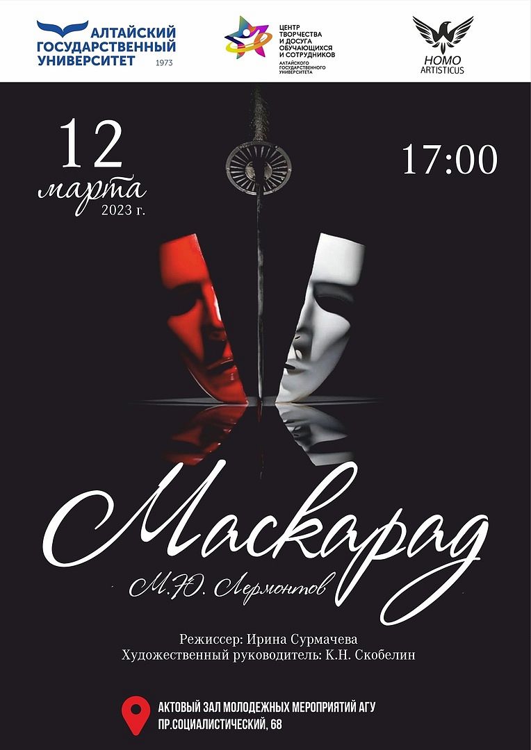 Приглашаем вас на премьеру спектакля театральной мастерской «Homo Artisticus» Алтайского государственного университета — «Маскарад», по одноименной поэтической драме М.Ю. Лермонтова.