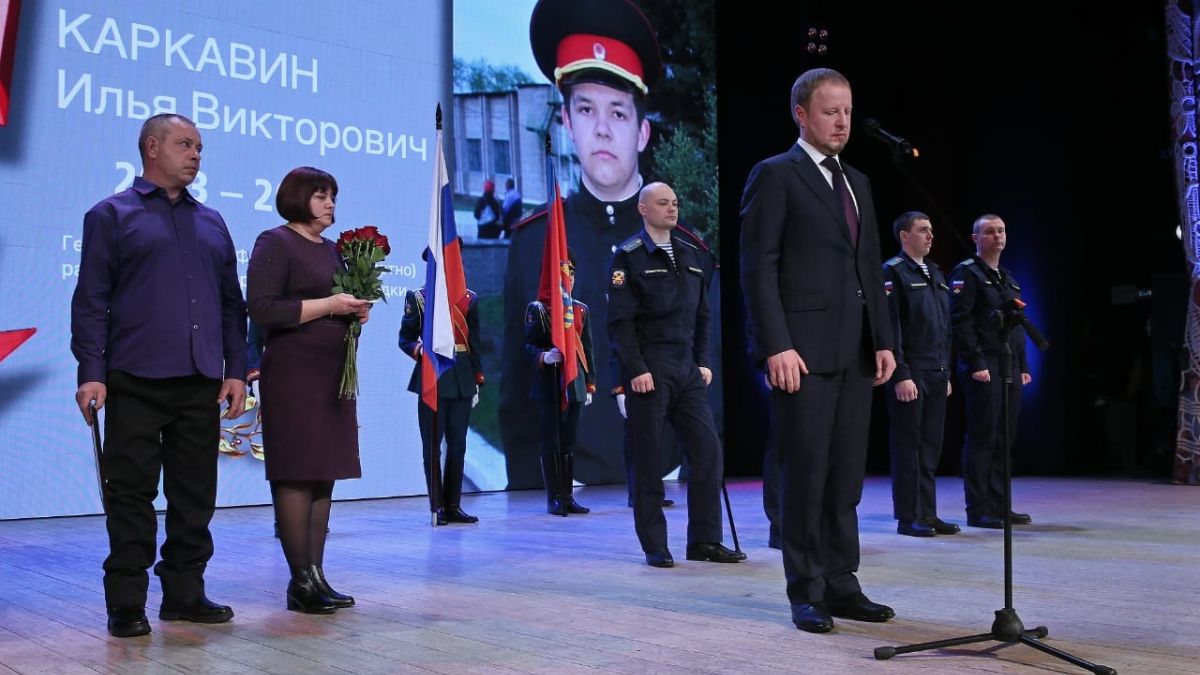 Золотую Звезду Героя России губернатор Виктор Томенко вручил родителям разведчика-снайпера глубинной разведки Ильи Каркавина 23 февраля.