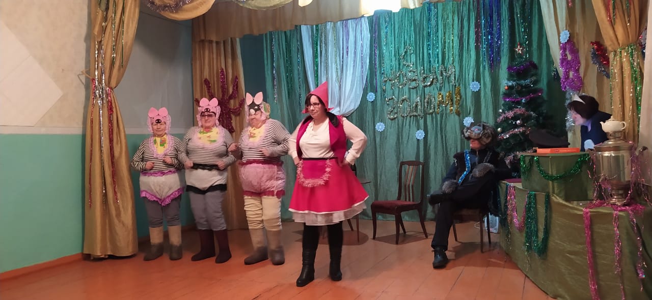 Юмористические персонажи спектакля: «Нюра-буфетчица» (Людмила Охременко), «Оперуполномоченный Даша» (Татьяна Балабаева), «Машенька» (Валентина Козлова), «Медведь» (Нина Дудукаленко), Медведица (Вера Литвинова) вызывали своей игрой смех в зале. Особый фурор на зрителей новогоднего представления произвел танец трех поросят (Надежда Ядрова, Татьяна Балабаева и Нина Дудукаленко). Празднично украшенная сцена, яркие и смешные костюмы персонажей, изготовленные своими руками, а также интересная игра актеров спектакля — все это вызвало восторг у зрителей. В завершение спектакля зрители провожали полюбившихся персонажей бурными аплодисментами с просьбой повторить спектакль на Старый Новый год. Всем, кто посетил в этот день Дом культуры, было весело. Публика расходилась по домам с прекрасным настроением в ожидании чего-то нового и лучшего в наступающем 2023 году.
