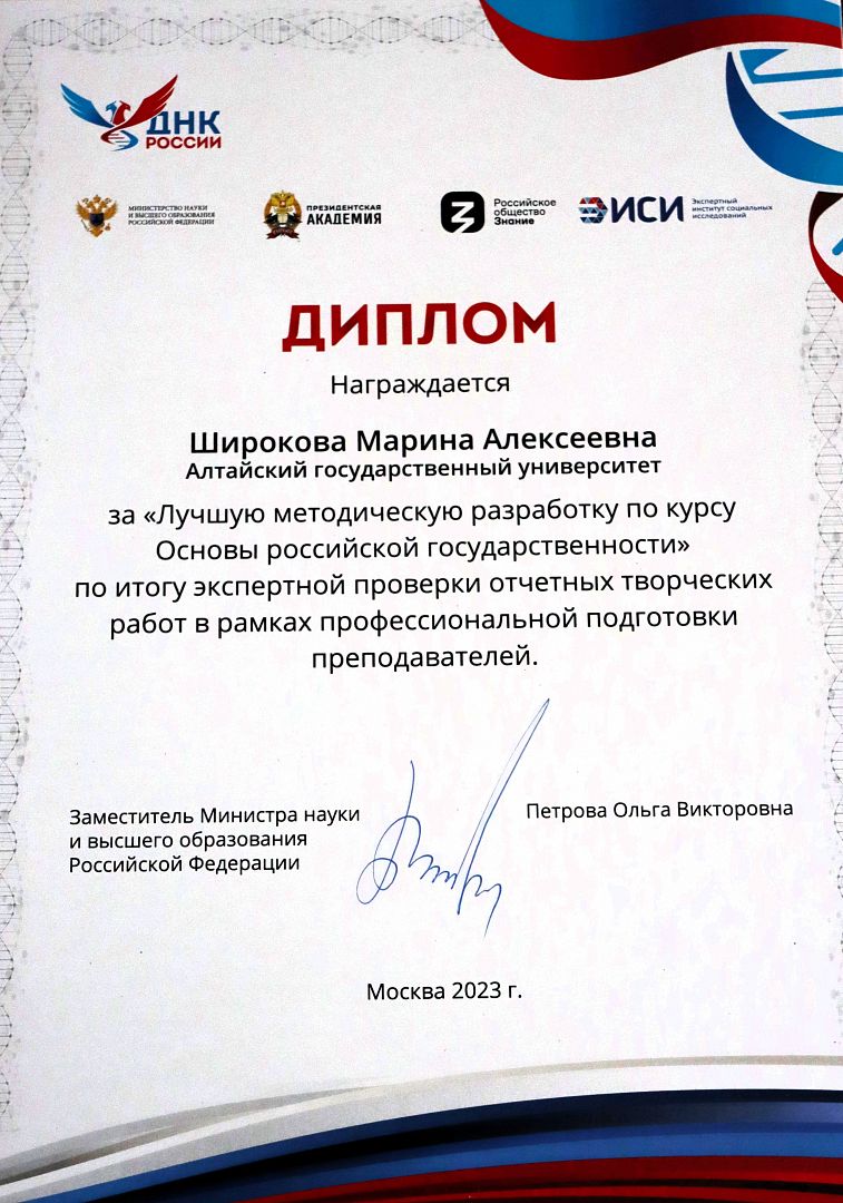 Профессор кафедры философии и политологии ИГН, доктор философских наук, кандидат исторических наук Марина Широкова награждена дипломом Министерства науки и высшего образования Российской Федерации за лучшую методическую разработку по курсу «Основы российской государственности».