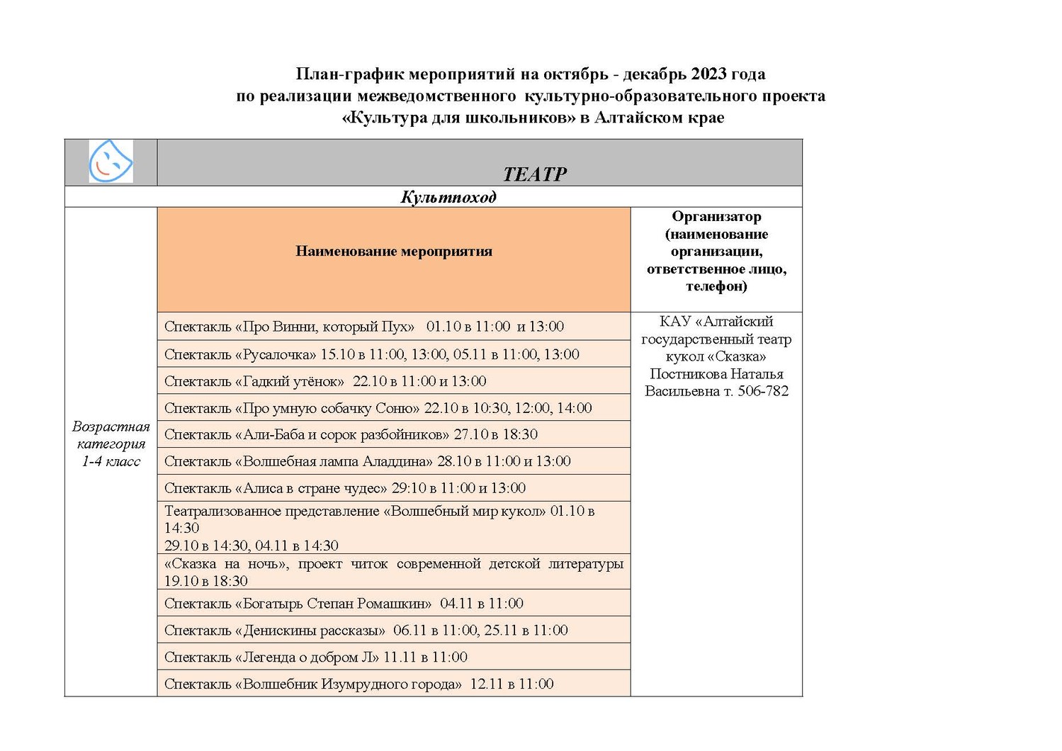План-график мероприятий на октябрь - декабрь 2023 года - «Культура для школьников» в Алтайском крае