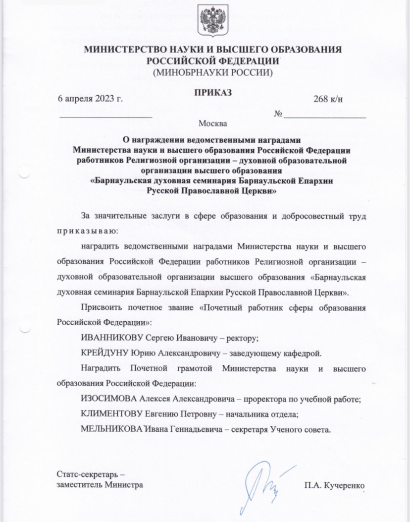 На основании решения ведомственной комиссии Министерства науки и высшего образования Российской Федерации от 6 апреля 2023 г. был подписан приказ о награждении ведомственными наградами Минобрнауки России работников Религиозной организации — духовной образовательной организации высшего образования «Барнаульская духовная семинария Барнаульской Епархии Русской Православной Церкви»