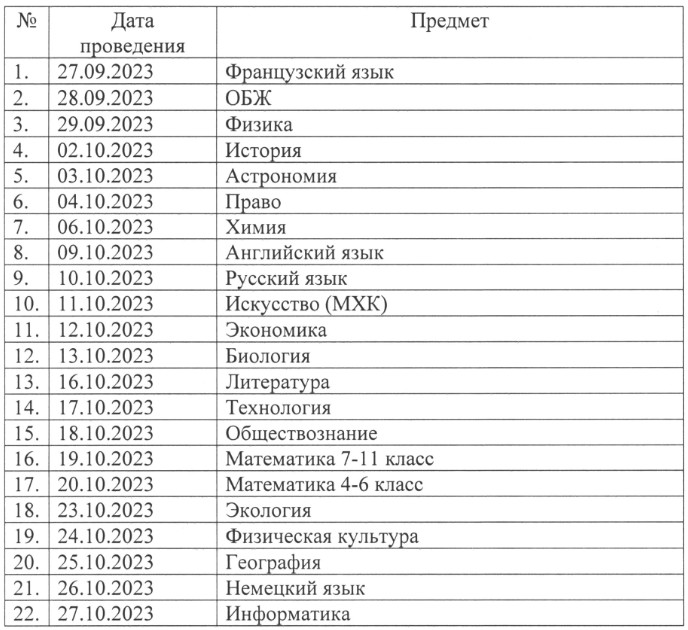 График проведения школьного этапа ВсОШ в 2023/2024 учебном году: