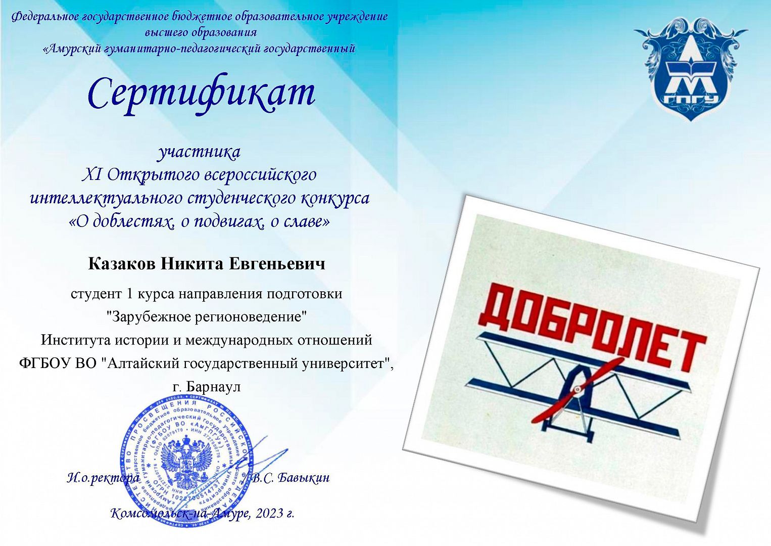 7 апреля студенты ИИМО Никита Казаков, Владислав Терещенко и Егор Куценко приняли участие во Всероссийском открытом интеллектуальном студенческом конкурсе «О доблестях, о подвигах, о славе», посвященном развитию авиации в России и приуроченном к 100-летию Российского общества добровольного воздушного флота «Добролёт».