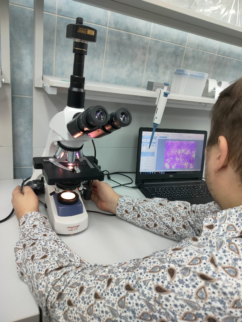 К.б.н., доцент кафедры общей биологии, биотехнологии и разведения животных Владислав Андреевич Сарычев в лаборатории физиологического статуса животных продемонстрировал различные биохимические методы, в том числе метод изучения ДНК растительных клеток.