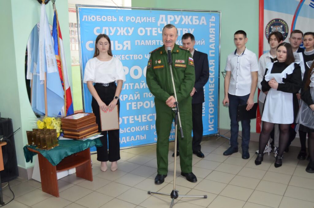 С приветственным словом к лицеистам и кадетам обратился председатель Алейского округа по работе с военными инвалидами РО ОООВИ «ВоИн» в Алтайском крае, ветеран боевых действий Белозёров Дмитрий Николаевич.