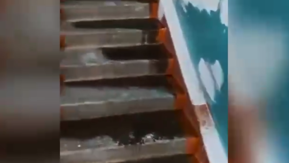 На кадрах видно, что вода течет по лестнице, стенам и потолку. Также потеки видны возле проводов, что представляет опасность для жителей.