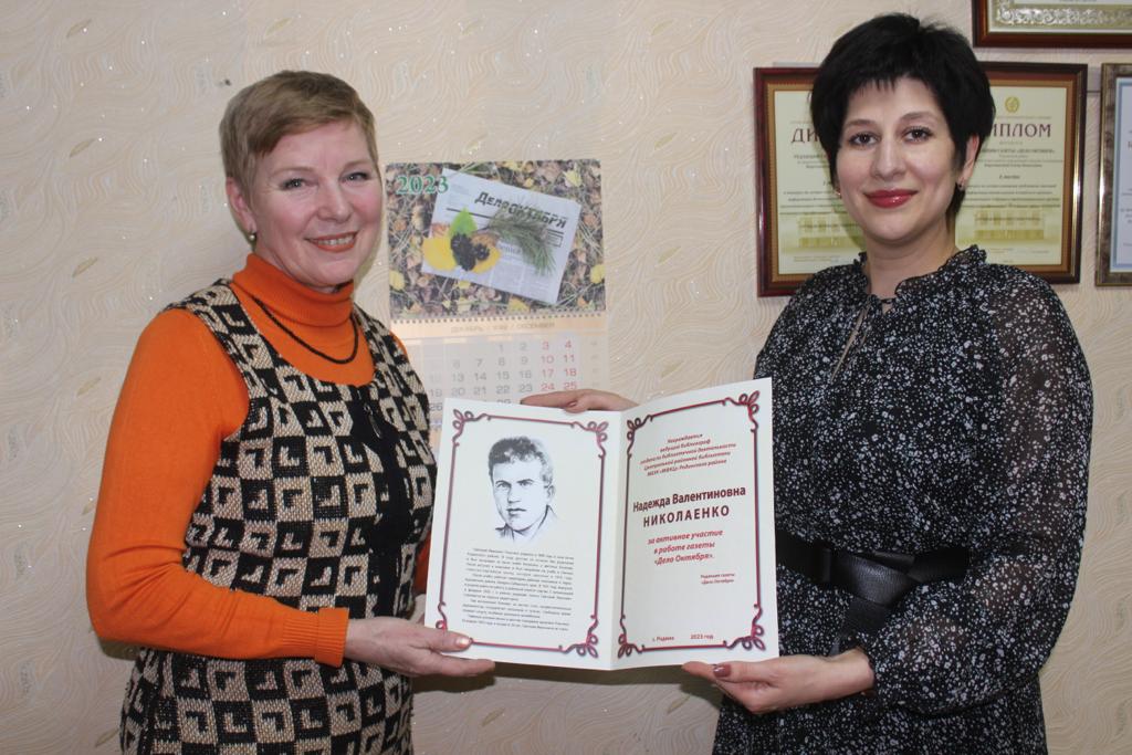 Главный редактор Елена Воротникова поблагодарила Надежду Валентиновну за активное участие в жизни районной газеты и вручила памятный Диплом и календарь с логотипом «ДО».