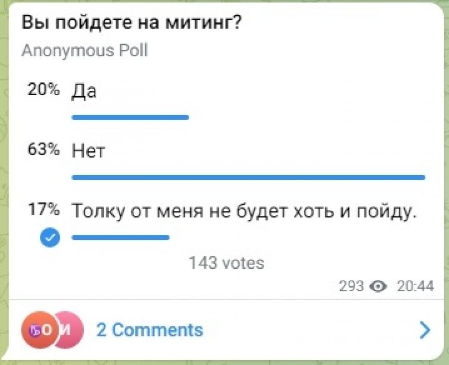 В то же время в телеграм-канале «Голос Бийска» запустили опрос: готовы ли бийчане выйти на митинг. Оказалось, лишь каждый пятый пошел бы на акцию – 20 процентов из опрошенных. Фото: телеграм-канал "Голос Бийска"63 процента однозначно сказали, что не выйдут на митинг. Еще 17 считают, что толку от митинга не будет, даже если бы они и пошли.