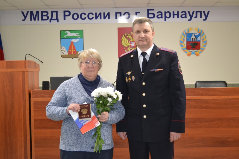 В торжественной обстановке паспорт, а также Конституцию Российской Федерации ей вручил начальник УМВД России по городу Барнаулу полковник полиции Александр Майдоров. Начальник Управления поздравил Татьяну Геннадьевну с приобретением гражданства, преподнес цветы и пожелал крепкого здоровья, благополучия и мирного неба над головой.