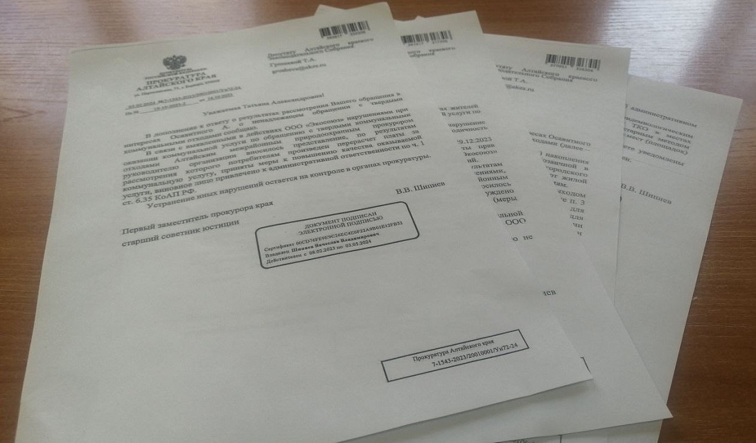 По обращению в краевую прокуратуру депутата фракции КПРФ в АКЗС Татьяны Грошевой выявлены нарушения в работе ООО «Экосоюз», а должностное лицо организации привлечено к административной ответственности.