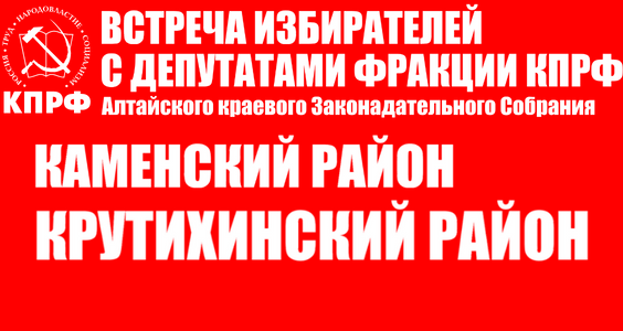 Фракция КПРФ в Алтайском краевом Законодательном Собрании запланировала 21 января выездное заседание фракции в Камне-на-Оби. В тот же день запланированы собрания депутатов и избирателей в селах Гонохово, Корнилово, Столбово, Рыбное Каменского района, а также в Крутихе, Боровом и Заковряшино Крутихинского района.