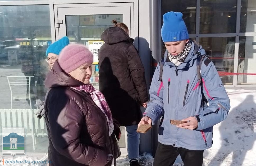 27 января проходит всероссийская акция памяти «Блокадный хлеб». В Белокурихе ее по традиции провели воспитанники патриотического клуба «Гвардеец» вместе со студентами Академии гостеприимства и центром культуры. Посетителям продуктового магазина крупной сети волонтеры вручали те самые 125 граммов хлеба – суточного пайка ленинградцев.