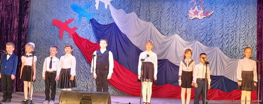 В адрес мужчин прозвучали поздравления с праздником, самые лучшие пожелания от заместителя главы Администрации района, секретаря местного отделения политической партии «Единая Россия» Захарюты Н.Д. и заместителя начальника отделения пограничной заставы в с.Михайловка лейтенанта Горбунова Д.С. Концертная программа от начала до конца была пропитана духом патриотизма и гордости за нашу великую Родину. Зрителя радовали артисты от самых юных лет до людей золотого возраста. Открыли программу танцевальной композицией ребята 3 класса Бурлинской средней школы, что сразу настроило зрителя на праздничный лад. Народный хор им.В.Филатова, инструментальный ансамбль «Каламбур», женская вокальная группа «Маков цвет», театр-студия «Овация», детские вокальные группы «Капитошка» и «Ассоль», сольные исполнители, а также выпускники Бурлинской СОШ с удовольствием делились своим творчеством. В фойе Дома культуры был оформлен стенд «23 февраля всегда на страже мира и добра», пришедшие с удовольствием использовали его в качестве фотозоны.