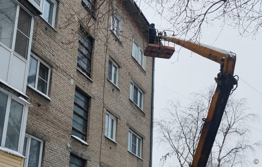 Управляющими компаниями с помощью привлеченной техники сегодня, 5 января, проведены работы по удалению сосулек, наледи, снежных масс с кровель многоквартирных жилых домов по ул.