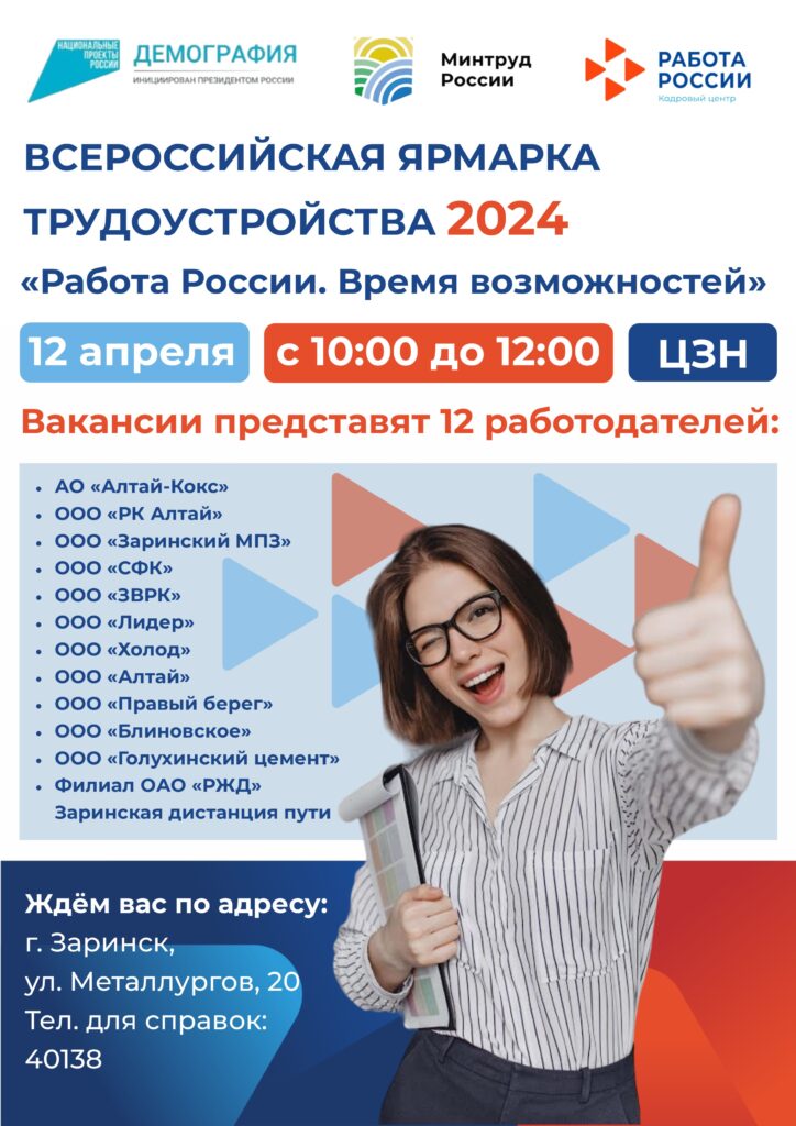 12 апреля в Алтайском крае стартует региональный этап Всероссийской ярмарки трудоустройства «Работа России. Время возможностей». В Заринске мероприятие пройдет в центре занятости населения с 10:00-12:00 часов.