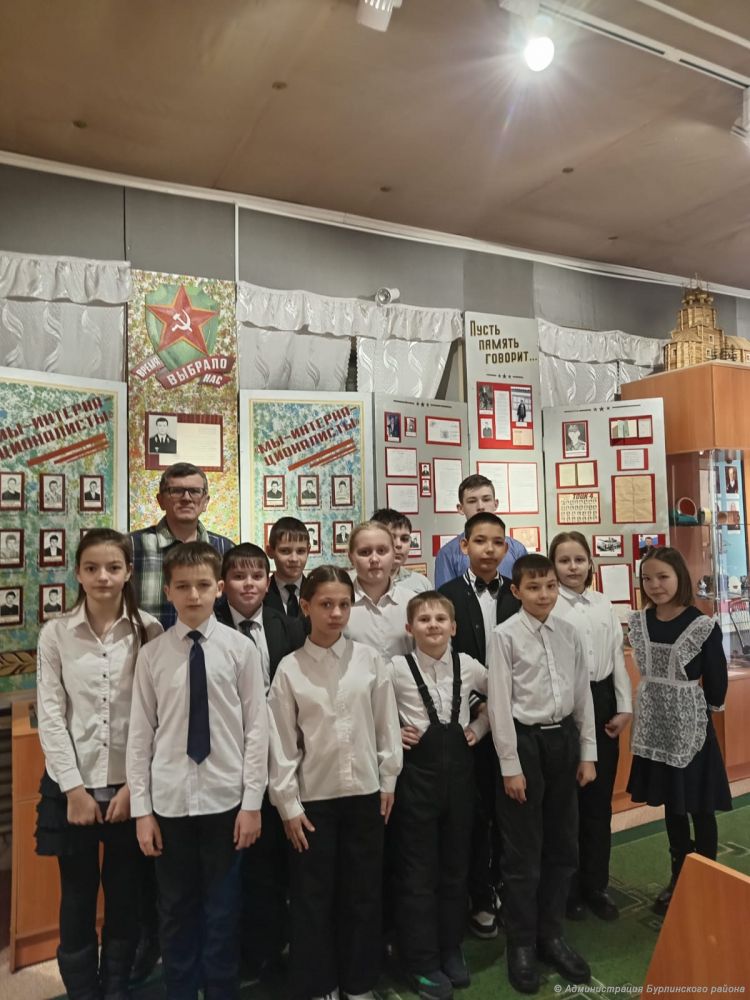 В рамках месячник военно-патриотического воспитания 1 февраля в районном краеведческом музее побывали учащиеся 5А класса Бурлинской СОШ (кл.руководитель Шемчук О. В.).