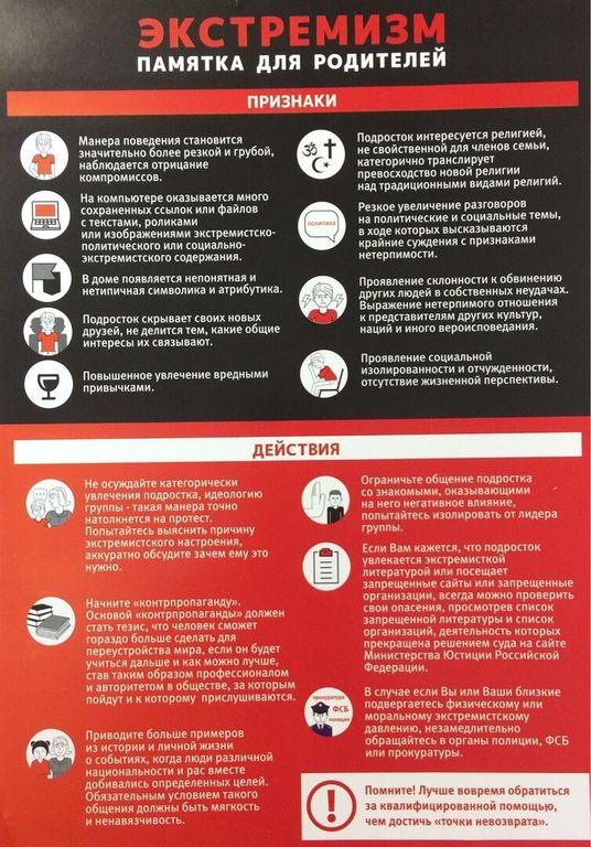 Основной «группой риска» для пропаганды экстремистов является молодежь как наиболее чуткая социальная прослойка. Причем молодежь подросткового возраста, начиная примерно с 14 лет — в эту пору начинается становление человека как самостоятельной личности. Важно помнить, что попадание подростка под влияние экстремистской группы легче предупредить, чем впоследствии бороться с этой проблемой.