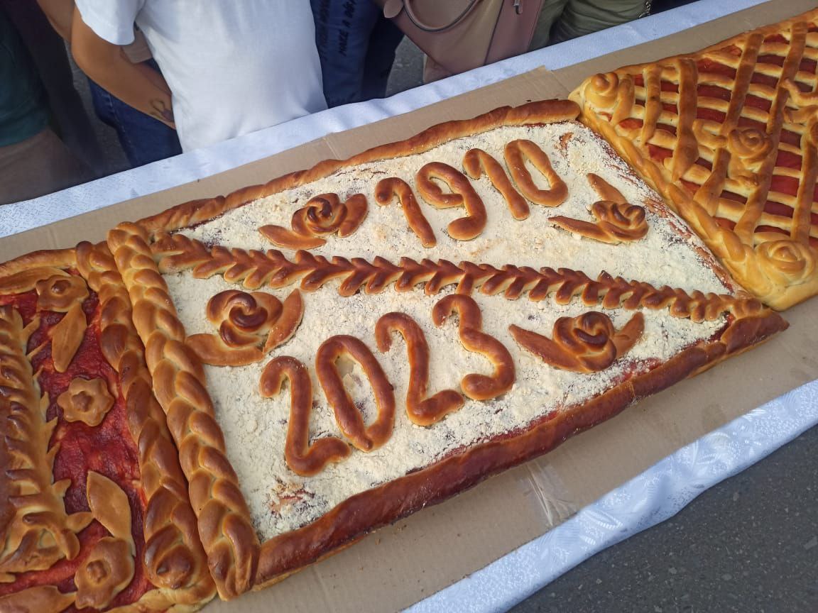 На Центральной Площади города славгородцев и гостей города угощают праздничным пирогом.