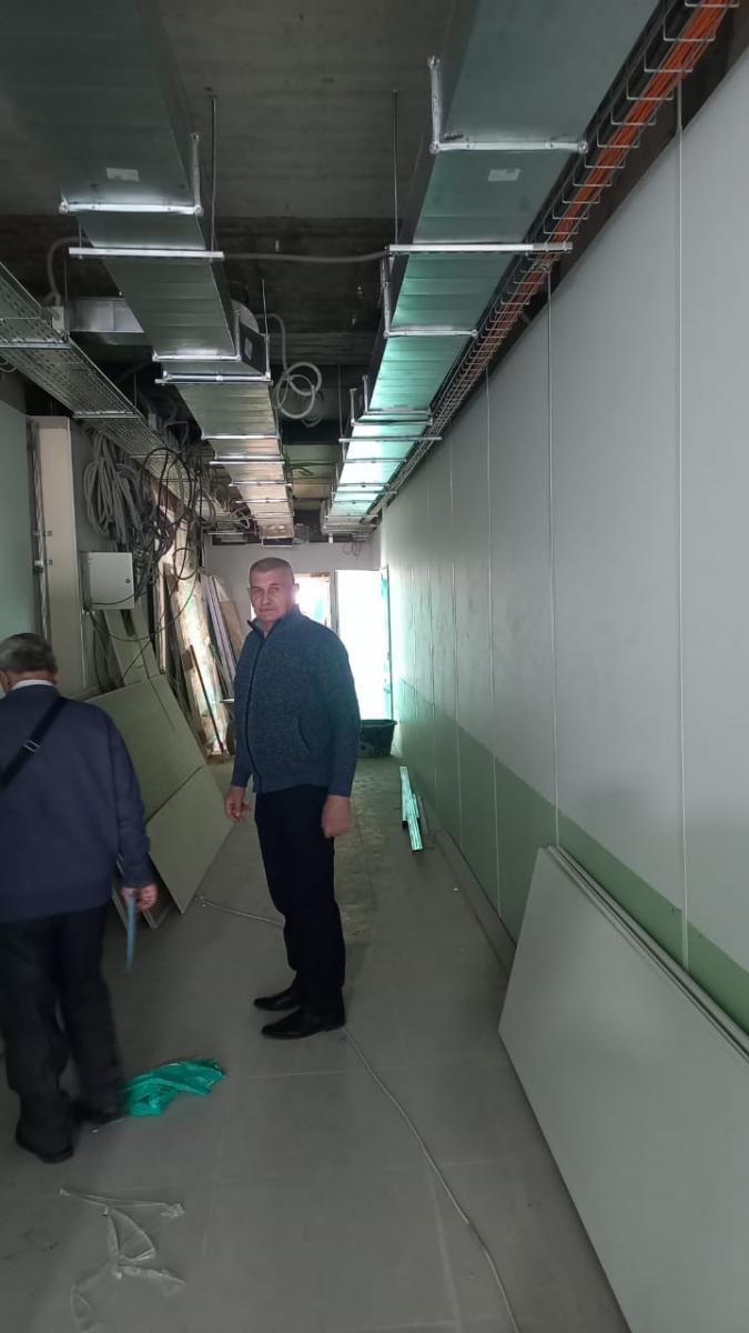 Ведётся активная работа по облицовке стен и перегородок по металлическому каркасу листами облицовочных панелей. Производится установка дверных блоков, облицовка оконных откосов, покрытие полов из линолеума, а также установка приборов отопления.