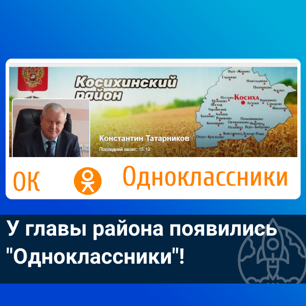 Новости от первого лица Косихинского района теперь смогут увидеть и пользователи социальной сети «Одноклассники». Константин Татарников на днях создал в этой соцсети официальную страницу.