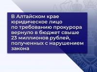 В Алтайском крае юридическое лицо по требованию прокурора вернуло в бюджет свыше 23 миллионов рублей, полученных с нарушением закона