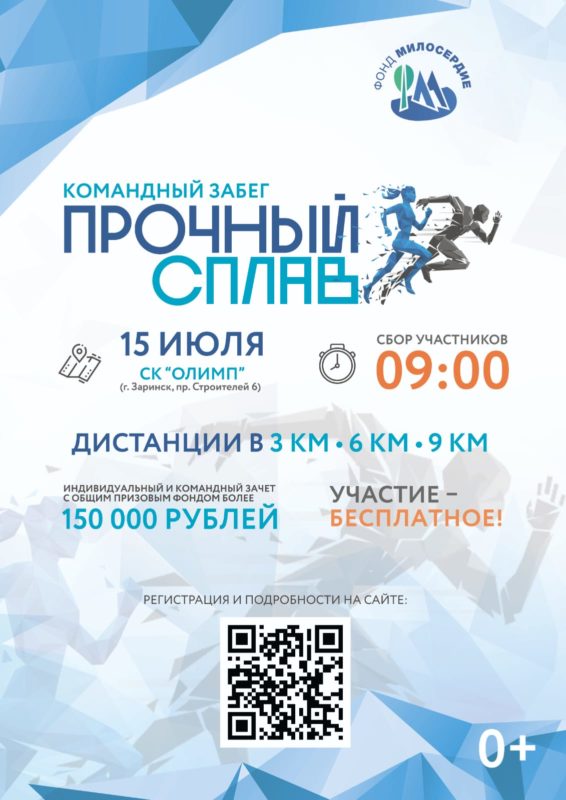 Принять участие в забеге сможет любой желающий. Организаторами выступают администрация города и благотворительный фонд «Милосердие» — социальный партнер Группы НЛМК. Призовой фонд – более 150 000 рублей. Пройти регистрацию на забег «Прочный сплав» можно здесь https://zarinsk.nlmk-sport.ru/.