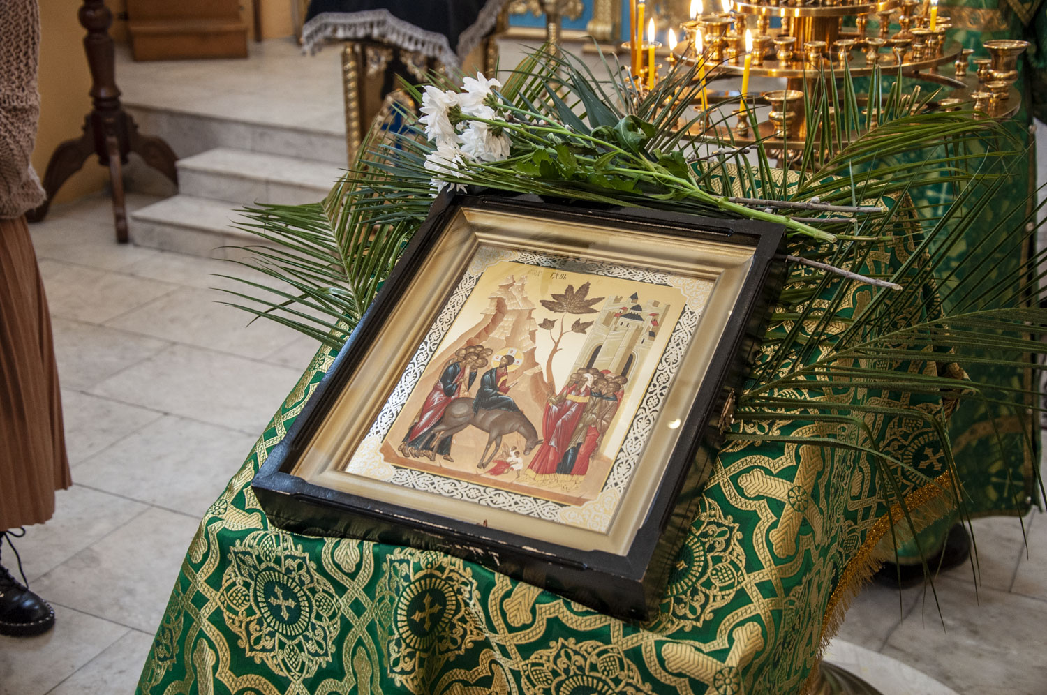 В завершение богослужения у иконы Входа Господня во Иерусалим в центре храма было совершено славление: духовенство попеременно с хором пропели тропарь, кондак и величание праздника. После прочтения уставной молитвы ветви верб, которые держали в руках богомольцы во время богослужения, были окроплены святой водой.