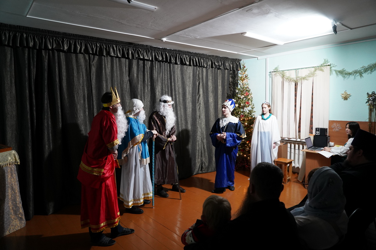 В этот чудесный день все вспоминают события, связанные с необычным Рождением Богомладенца. Сама мысль, что Бог придет на землю к человеку необычна и сказочна. Радует то, что дети воскресной школы с удовольствием откликнулись на возможность поучаствовать в спектакле и хотели исполнять любые роли, лишь бы быть причастными к этой великой истории Божественного рождения. Студенты семинарии сыграли роли волхвов и разбойников.