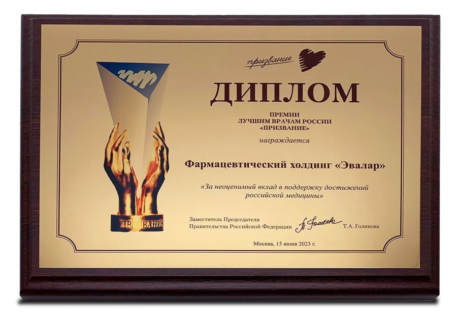 Диплом премии "Призвание - 2023" Фото: ЗАО "Эвалар"Главная в России медицинская премия для врачей учреждена Первым каналом, Министерством здравоохранения РФ и Благотворительным фондом поддержки достижений в области медицины «Призвание» в 2001 году. Номинантами и победителями премии становятся самые выдающиеся достижения в области медицины: проведение уникальных операций и разработка новых методов лечения и диагностики, яркие научные открытия и другие достижения, внесшие самый значительный вклад в развитие отечественной медицины и т.п.