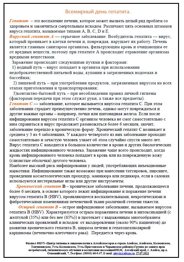С 28 июля по 4 августа работает телефон «горячей линии» приуроченной ко Всемирному дню борьбы против гепатита.