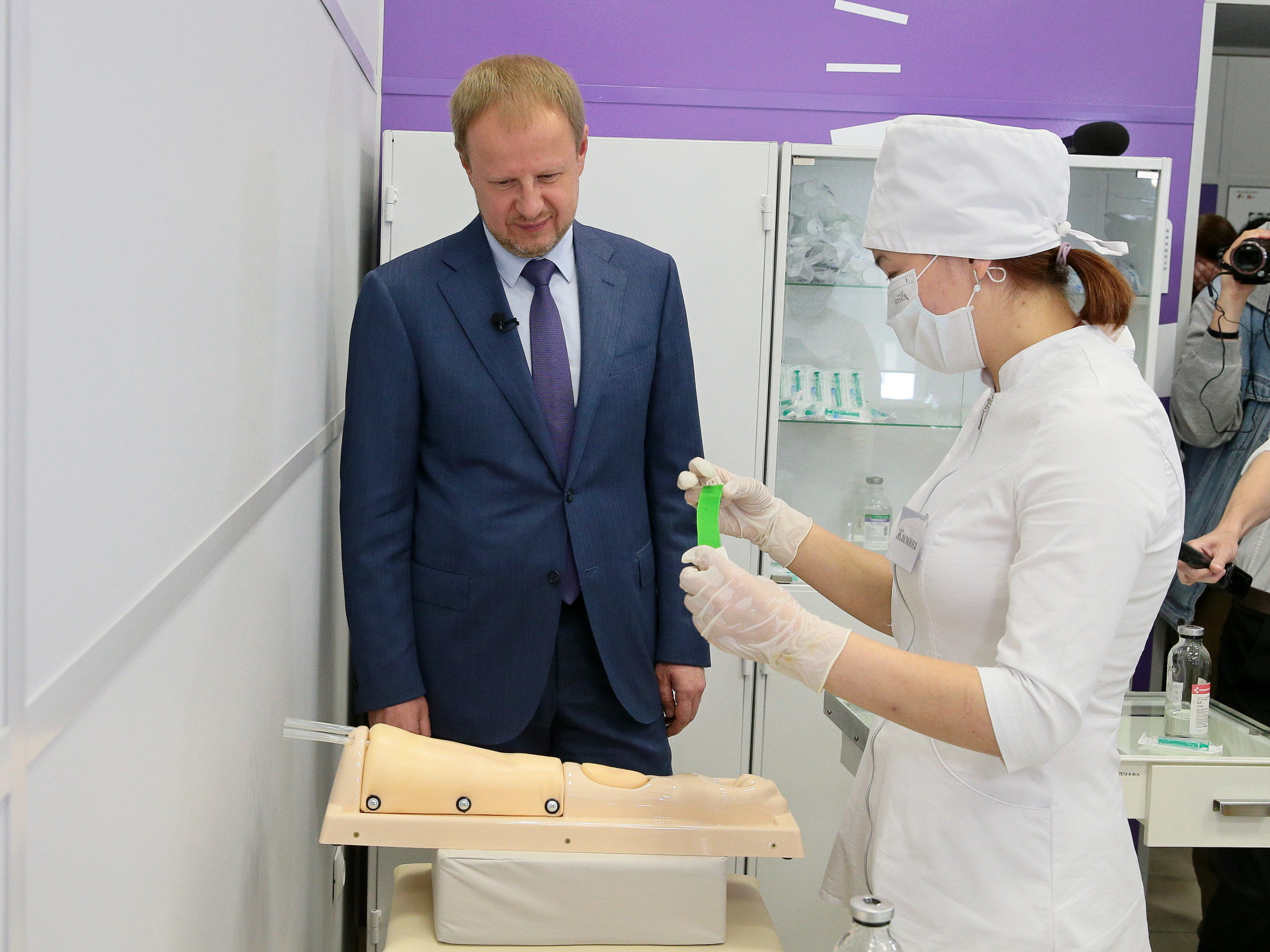 Губернатор осмотрел Барнаульский медколледж, где учатся будущие фельдшеры, и пообщался с будущими медикамиГубернатор Виктор Томенко осмотрел ФАП на территории колледжа, принял участие в “тестовом” первичном приеме пациента: запись в АРМ-поликлинике, пульсоксиметрия, измерение давления под наблюдением студента-медика. Затем он осмотрел кабинета домашнего ухода, кабинет функциональной диагностики, операционную, палату стационара и кабинет психоэмоциональной разгрузки. Все это — учебные помещения, где будущие медики отрабатывают полученные во время учебы навыки. В колледже оборудованы условия, максимально приближенные к реальной работе медиком. Директор колледжа поблагодарила губернатора за поддержку, благодаря которой удалось оборудовать учебное заведение и сделать ремонт в общежитиях. Также он поговорил со студентами о том, где они планируют в будущем работать.