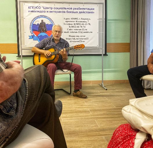 В минувший вторник в Центре социальной реабилитации инвалидов и ветеранов боевых действий прошло групповое занятие по музыкотерапии «Песни под гитару». Приглашенный гость — ветеран Афганистана Свирин Сергей Алексеевич исполнил песни о любви и войне.