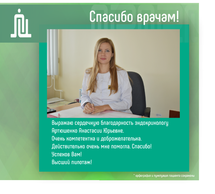 «Выражаю сердечную благодарность эндокринологу Артюшенко Анастасии Юрьевне.