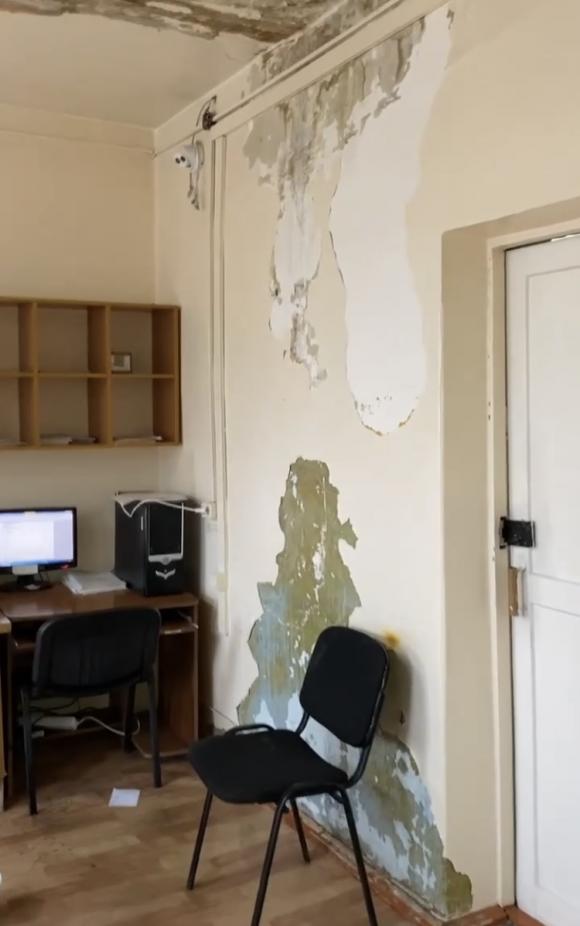 Врач Анастасия сообщила накануне, что во время дождей в здании поликлиники на Карла Маркса с потолков бежит вода, некоторые помещения зимой прогреваются максимум до 10 градусов, а недавно в хирургическом кабинете на пациента упал кусок штукатурки.