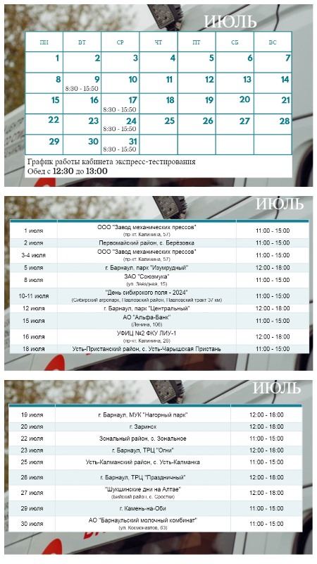 Алтайский краевой центр по борьбе со СПИДом опубликовал график экспресс-тестирований на ВИЧ в июле.