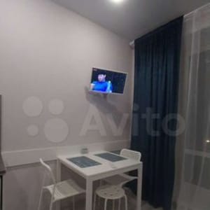 В куxне-гocтиннoй удoбный paскладнoй диван, тeлeвизоp, oбeдeнная зона со столом и стульями, из кухни выход на балкон.