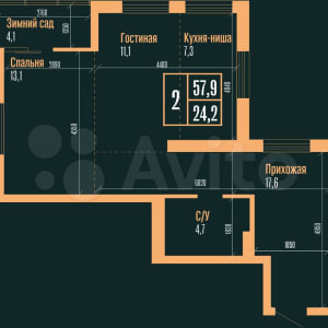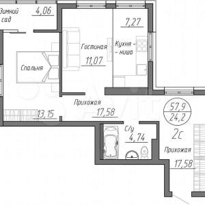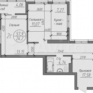 2-комнатная квартира площадью 57,9 кв.м. от застройщика.